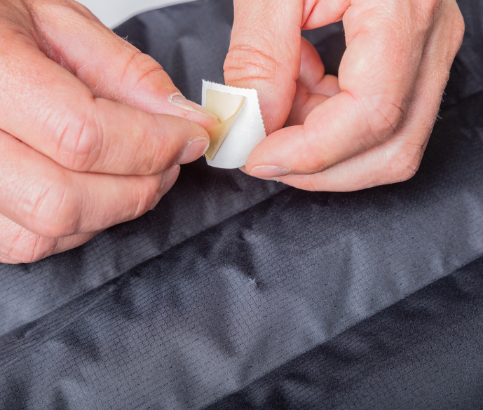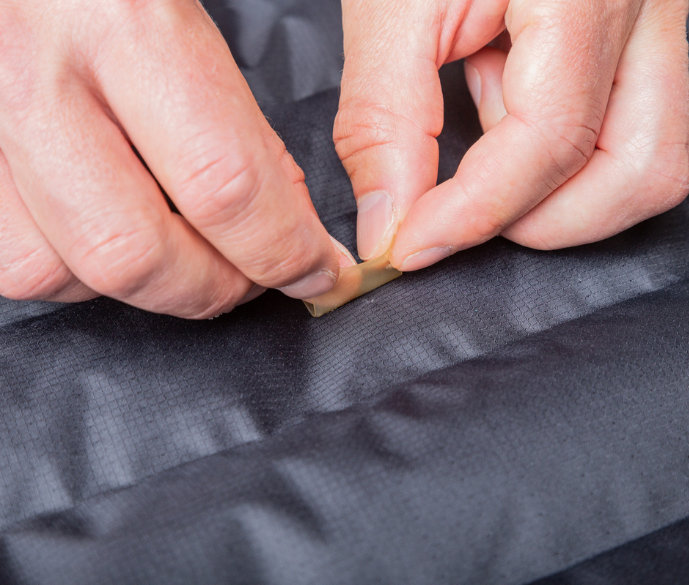 Specialist repair tapes such as Tenacious Tape™ or Betrafol® Tape can also be very effective at repairing small punctures, but they do have a somewhat distinctive aesthetic. Please be aware however that such tapes, whilst extremely durable and often able to endure sustained use even at very low temperatures can leave residual marks which when taken off are near impossible to remove.