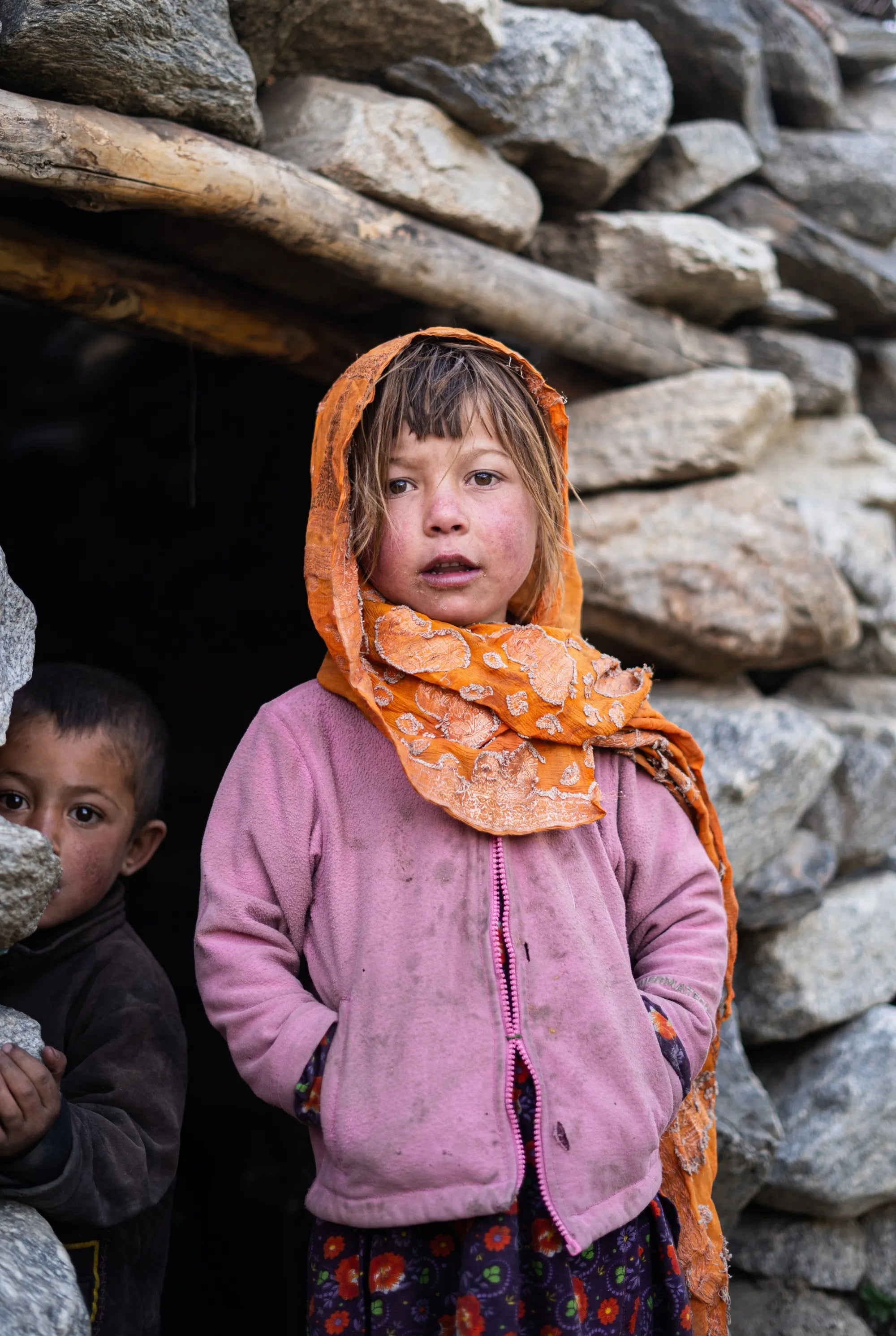 After a short two hour walk from the roadside village of Koyo Zom we arrived at our base camp spot. Our base camp was beside some villagers' summer huts where they stayed whilst their herds of sheep and goats grazed on the higher hill side. No westerners have ever approached the mountain from this side and our arrival at the camp produced a fair amount of excitement. At first the women and children were very shy and didn't know what to make of us. The girl in this photo was one of the first to start being confident with us, keen to join in when we started throwing a tennis ball around. This image captures her character perfectly with her grown up posture, gazing out confidently at the world with her little brother still not sure about us. It wasn’t long until they were all out trying to talk to us but we could only communicate through drawing as even our base camp staff only shared a few words of their local dialect. The little boy in the background of this photo, took great delight when Tom played him some techno.