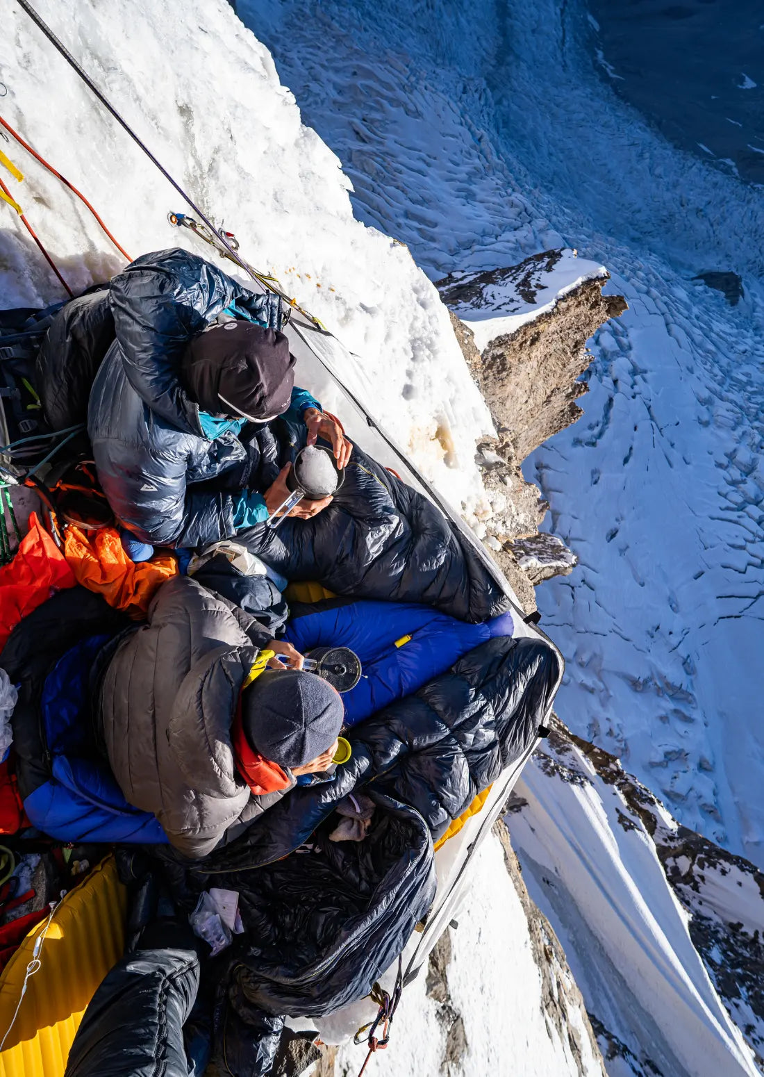Our third bivi was in such a unique position. At first glance we thought it was going to be an uncomfortable night. However, with the use of the snow hammock Mountain Equipment had made us, we turned this bum cheek ledge into a space where we could all curl up and lie down. It ended up being really comfortable and one my most memorable bivis ever. I have this image on my wall and it gets people asking questions.
