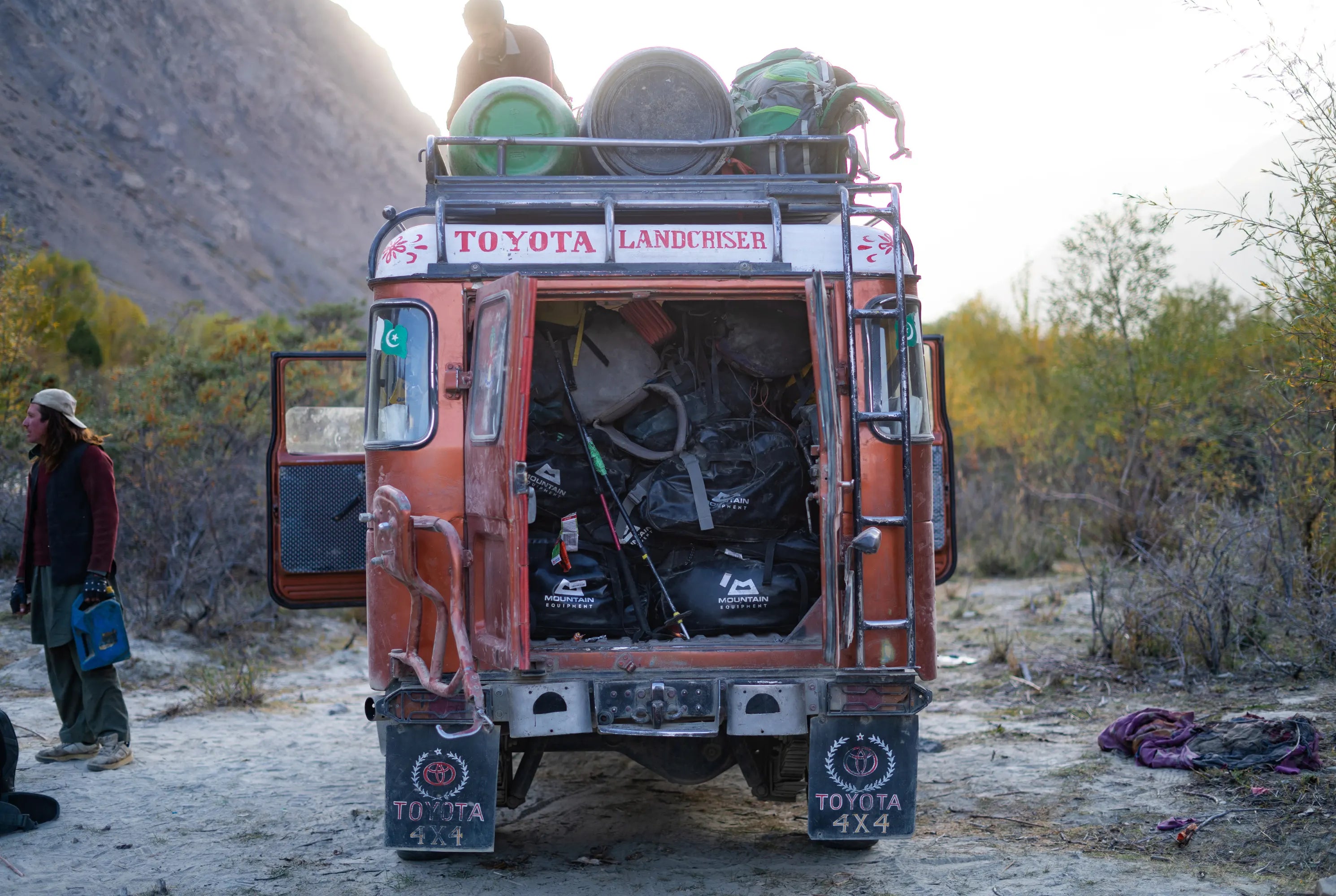 Taking good photos of the duffle shuffle is actually quite hard. I've spent a lot of time snapping photos of bags being thrown on yaks, dragged through airports and train stations but they often look staged or are too messy. I had been through quite a bit in the last seven days (six days of climbing and 24 hours of rescue coordination madness) and all I wanted was to get in this Land Cruiser and sleep. Maybe my tired brain helped me to think simply and rather than trying to get photos of people loading the bags, I just waited and took a photo of some bags in a jeep. Doesn't sound like it would be good but I think it's the best duffle shuffle shot I've ever taken.