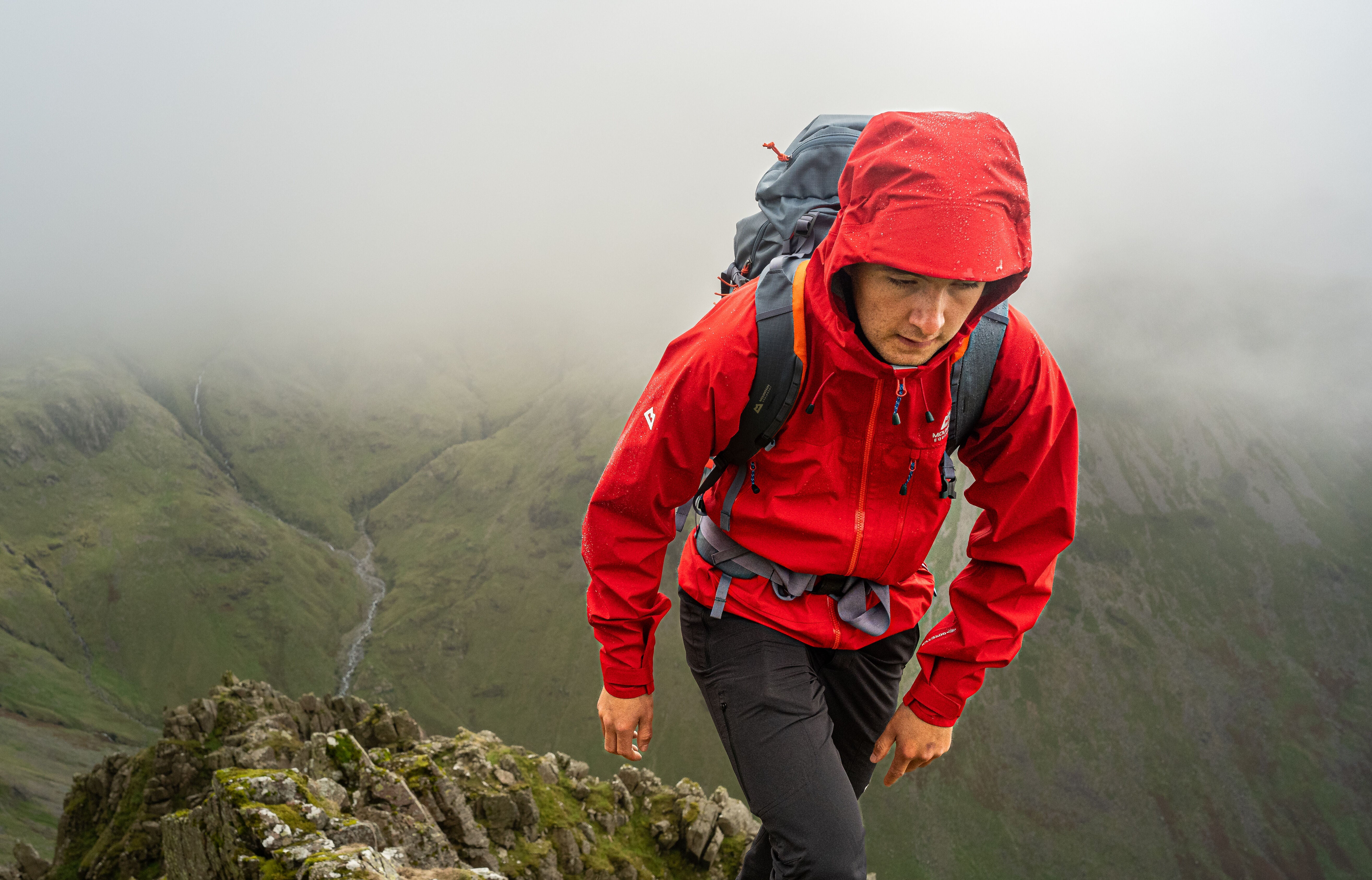 A good fit is essential. If you are wearing a waterproof jacket for summer mountain running then the fit requirements are different to if you plan to use the jacket for winter climbing, and so consider not only your body shape but your intended use and what layers you plan to wear the jacket with. Ensure you can raise your arms overhead without exposing your midriff, that the cuffs are long enough to cover your wrists and prevent water coming down them, and that the hood allows you to look all around without restriction. In basic terms our Active Fit is our trimmest fit, our Alpine Fit a perfect middle ground, and our Mountain Fit our most roomy, but there may be slight variation from model to model.